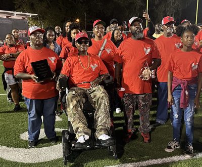 Demetrice Hankerson (second from left) is joined by family and friends in watching a video of some of his highlights in football and track and