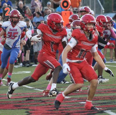 The Tornadoes marched 56 yards for a score on their first drive of the game. Runs of 3 yards by Swade Britt and 8 yards by Cubbedge resulted in first downs, while quarterback Tony Richardson completed passes of 9 yards to Cameron Hampton and 7 yards to Braylon Shanks to set up a first down at the Baker 13-yard line. Cubbedge and Carter Three straight run plays netted just 2 yards, but Cubbedge caught a short pass on fourth-and-8 and turned it into an 11-yard touchdown at the 7:52 mark of the first quarter. Hampton’s run on the two-point play was good for an 8-0 Bradford lead.