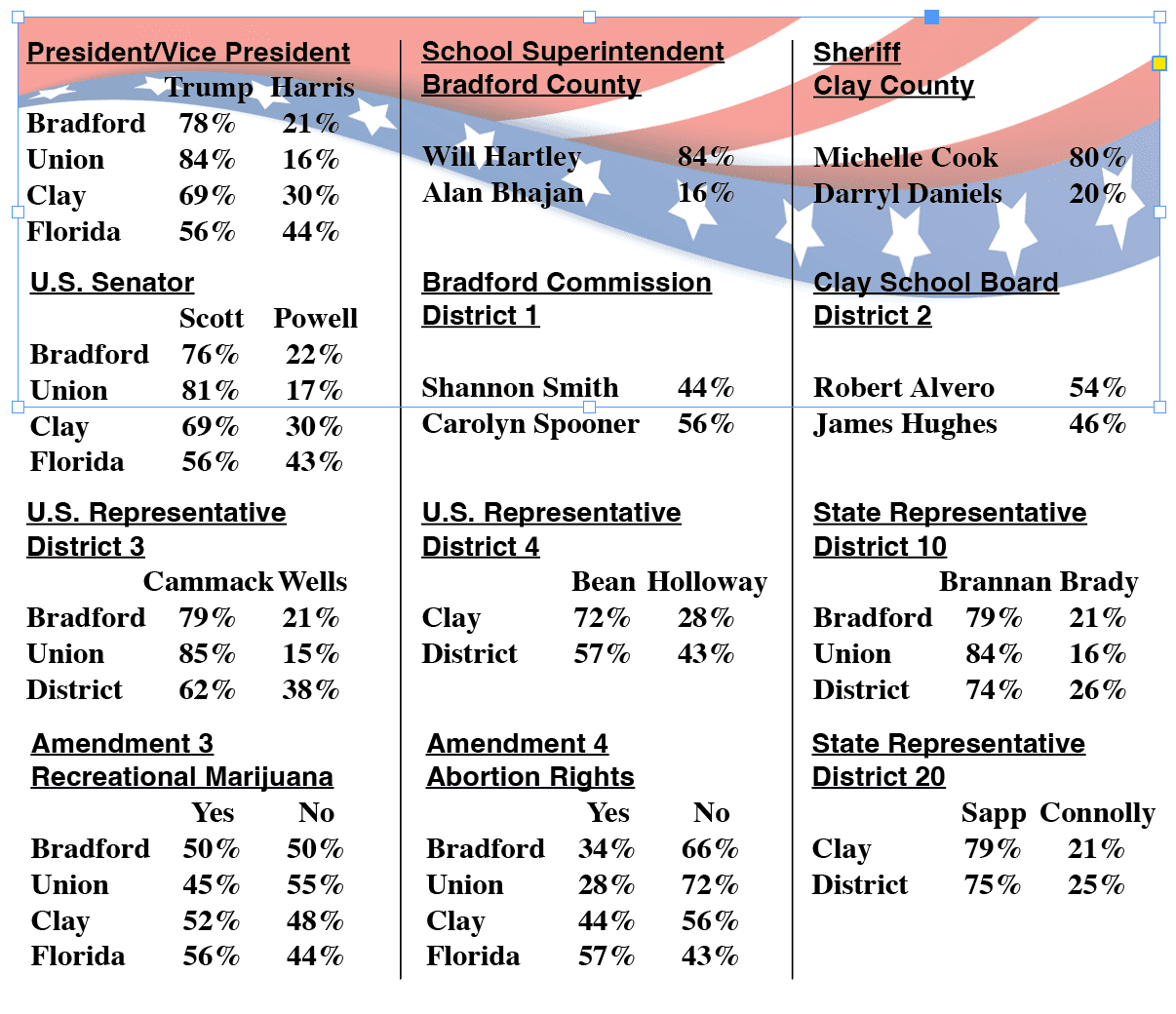 The results are all unofficial until certified. For more on the election and results in other races, visit www.votebradfordfl.gov, www.unionflvotes.com and www.clayelections.gov.