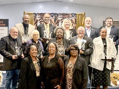 Financial sponsorship is key to the success of the CCBC and each sponsor was recognized with an award at the MLK Banquet: (front row, l-r) CCBC President Alica McMillian, Co-Chairs Janice Mortimer, and Glenda Ruise, (middle row Starke’s Jimmy Crosby (accepting for Folds and Walker), Kate Ellison (accepting for Linda Watkins), Carnell Williams, Scott Roberts (accepting for GFL Environmental), Commissioner Carolyn Spooner (representing the Bradford County Commission), (back row) Byron Ramseur for the Bradford County Sheriff’s Office, David McMillan of L&M Mobile Homes, Carol Saviak of FPL, Mayor Andy Redding of City of Starke, Starke’s Drew Mullins (accepting for Woodward & Curran).
