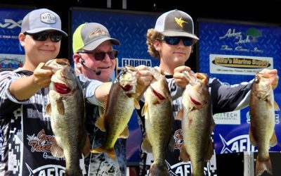 Keystone Heights High School students Jacob Beach (far left) and Ashton Alday (far right) teamed up to represent Keystone Heights Jr. Bassmasters and place first in Florida Bass Nation Junior/High School series tournament. The duo, fishing the St. Johns River out of Palatka, had a total weight of 19.18 pounds to top the field at the Fall Trail Qualifier #1 on Sept. 10. The second-place team had a total weight of 18.75 pounds. Alday and Beach, who competed against 130 teams from Florida and Georgia, were also seventh in the Big Bass category with a fish that weighed in at 5.01 pounds. The biggest fish weighed in at 7.67 pounds.