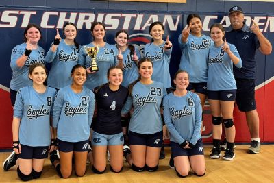 Northside Christian Academy’s volleyball team won the Western Division championship, defeating First Christian and Corinth Christian to get to the title match, where the Eagles defeated Hope Christian 2-1 (20-25, 25-22, 15-12). Pictured are (front, l-r) Stella Vahlakis, Briley Gay, Addison Wilson, Gabby Smith, Maddie Garrison, (back, l-r) Kaylea King, Baeleigh Bradley, Bella Smith, Ali LaFollette, Caydance Slayton, Brooklyn Cooper, Callie Potts and Coach Todd von Weyhe.