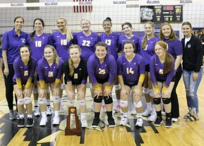 The Union County Tigers, pictured with their District 6-1A championship trophy on Oct. 20, earned another trophy on Nov. 1, defeating Aucilla Christian 3-0 in the Region 3 title match. Pictured are: (front, l-r) Bella Johns, Kamryn Southerland, Jurney Crim, Indi Knox, Jordan Hendricks, Sara Grace Vaughn, (back, l-r) Head Coach Tifani Knox, Jaycee Davis, Emily Wilson, Rylie Parrish, Jailyn Simmons, Morgyn Kirby, Layla Barber, Assistant Coach Jaelyn Jackson and Assistant Coach Tristyn Southerland. File photo by Cliff Smelley.